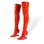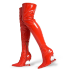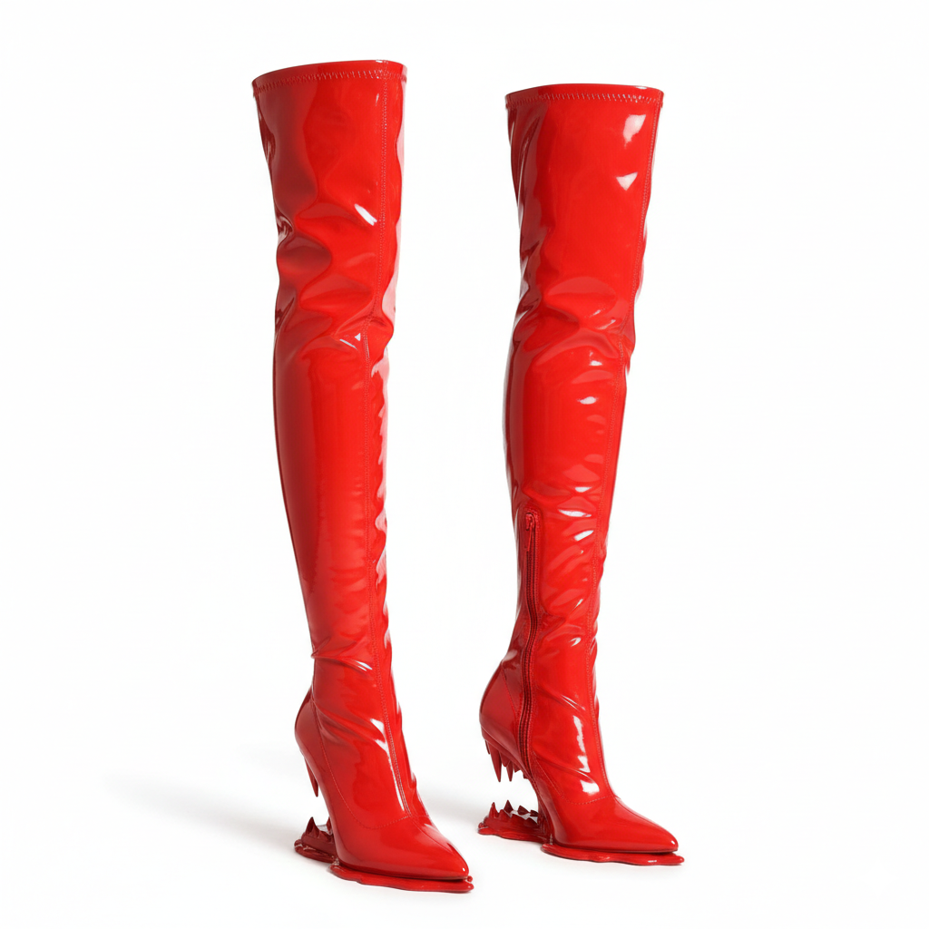 Botas altas de charol rojo tipo látex con punta y tacón con diseño colmillos de vampiro, estilo alternativo y cierre lateral.