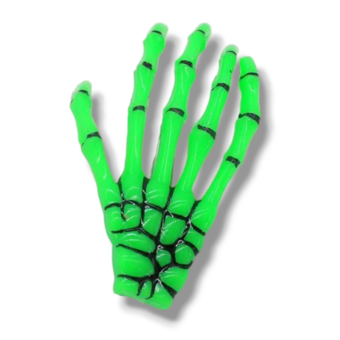 Pequeño, pero con toda la actitud. Este broche en forma de mano de esqueleto, en un vibrante verde neón, es el toque perfecto para quienes aman los detalles oscuros con un twist llamativo. Su acabado brillante y su diseño anatómico capturan la esencia macabra con un guiño juguetón, ideal para destacar sobre tu cabellera negra.