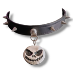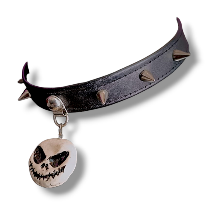 Los picos marcan presencia y el dije de Jack Skellington aporta ese detalle icónico que transforma cualquier outfit en un statement que no pasa desapercibido.