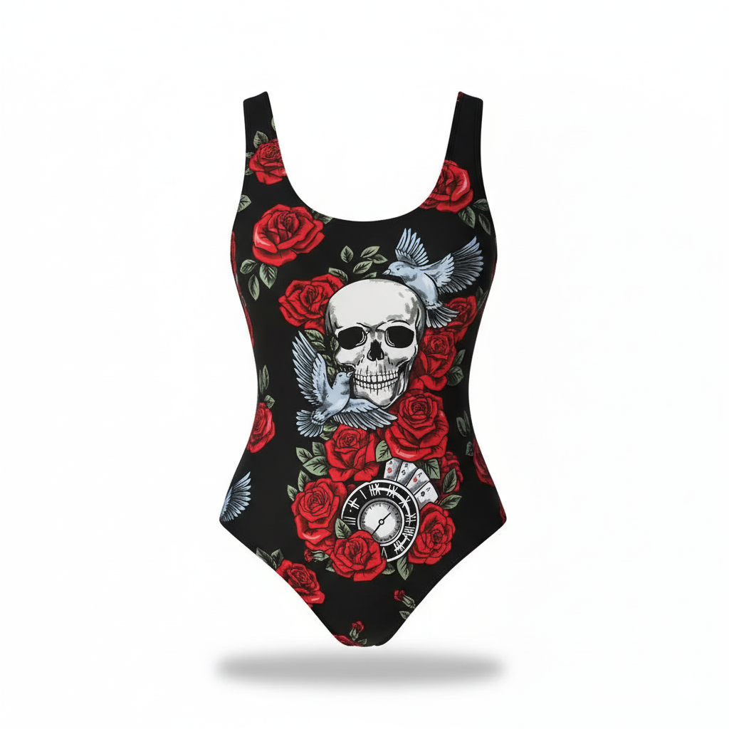 Traje de Baño Negro Calavera Flores Rojas